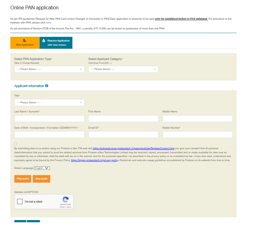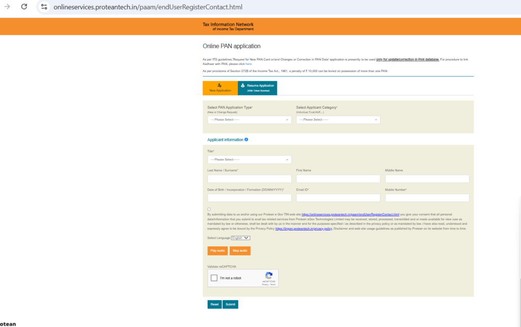 • “New PAN – Indian Citizen (Form 49A)” ಆಯ್ಕೆ ಮಾಡಿ